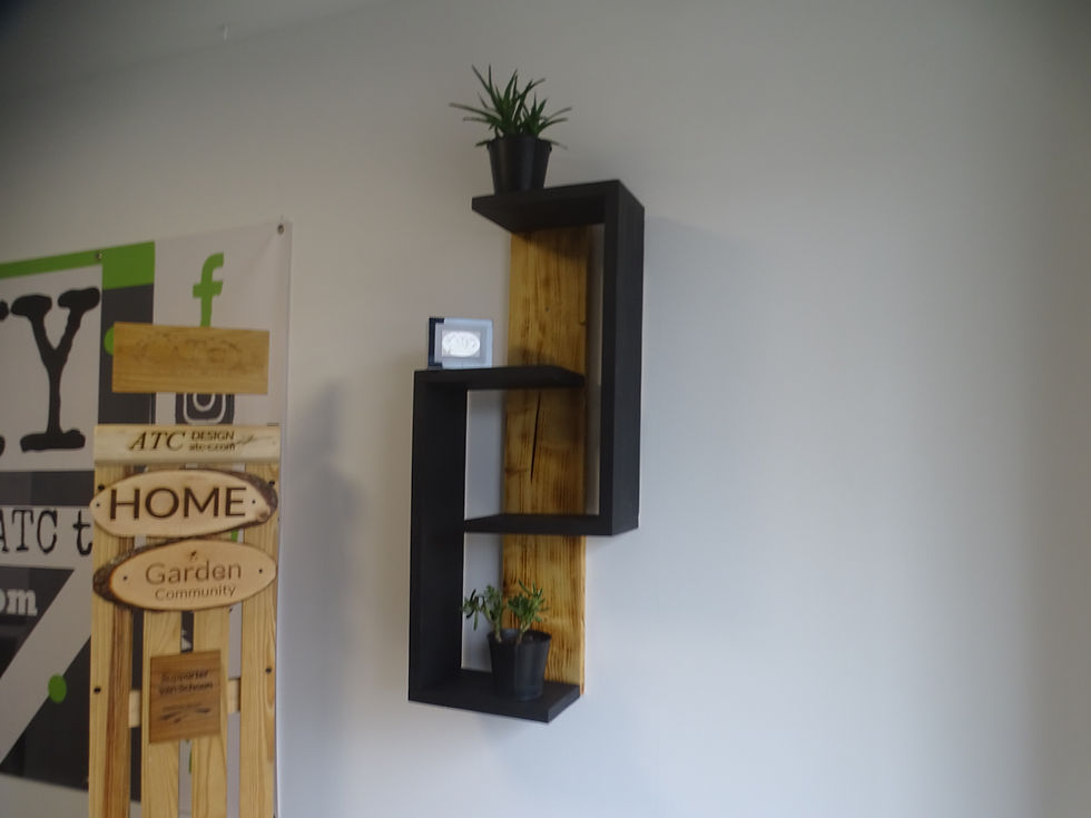 The contrast between the black geometric frames and the natural pallet wood gives a warm and modern look that fits perfectly in bathrooms and toilets.