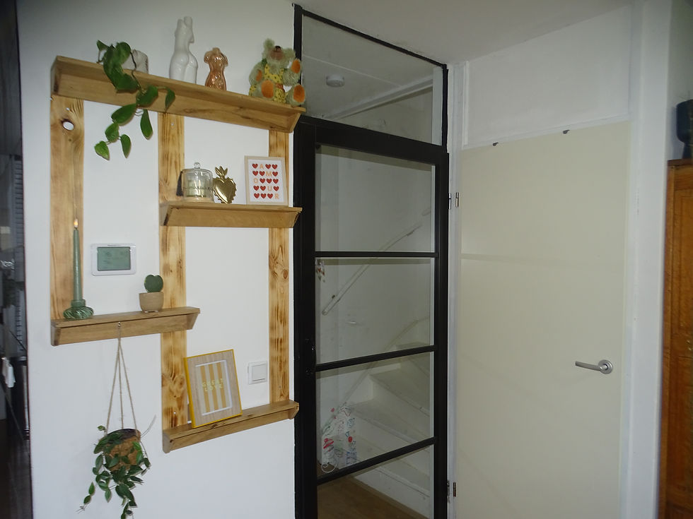 The idea was to build a wall feature that could serve as both decoration and storage.The vertical wooden slats form a beautiful background, while the shelves can hold plants, candles, frames, and everyday items.